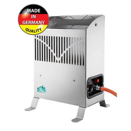 Varmeovn på gass med termostat som ikke trenger strøm. Passer perfekt til hytta, spikertelt, teltet, drivhus, vinterhagen, garasjen og lignende steder. Den kan også fungere som frostvakt. Veggfeste / fot bygger ca 4 cm.