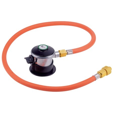 Regulatorsett som passer på griller som bruker ventilbokser med 7/16″ gjenger, så du kan bruke vanlig gassflaske med click-on ventil